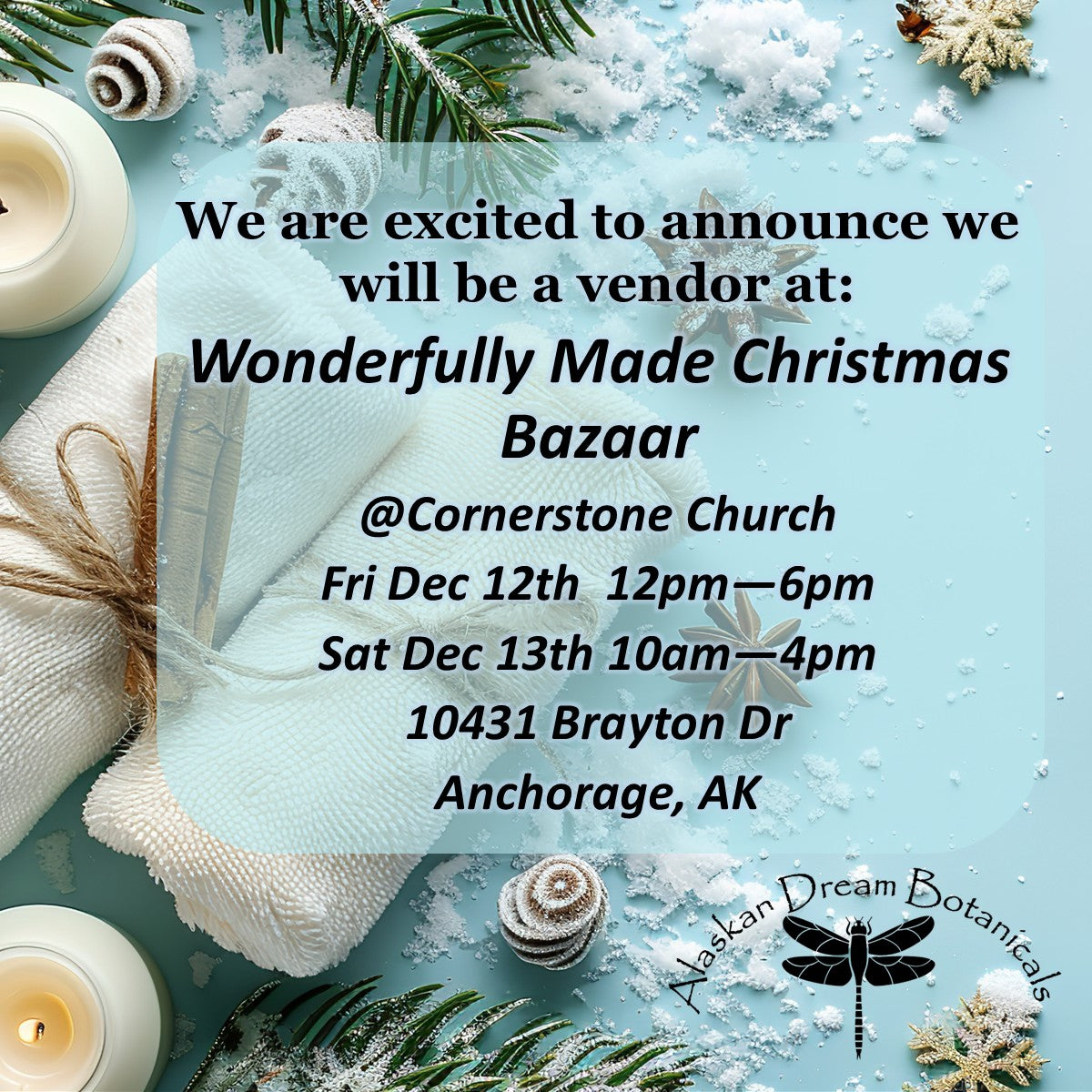 Embrace Winter: Alaskan Dream Botanicals Winter Scent CollectionExperience the wonder of Alaskan winter with our Winter Scent Collection—a curated blend of fragrances inspired by snowy landscapes, warm cabins, and crisp, frosty air. Each scent is handcrafted in small batches using locally inspired ingredients, inviting you to savor the season’s most enchanting moments.